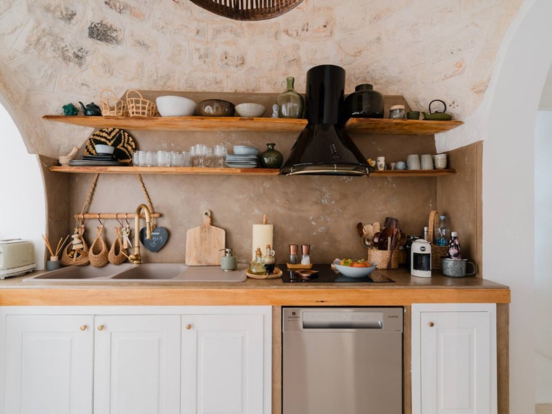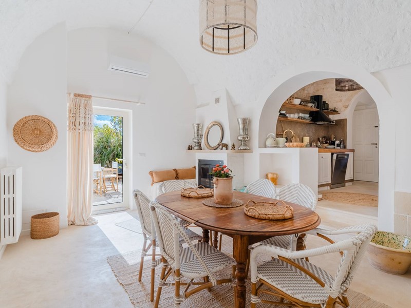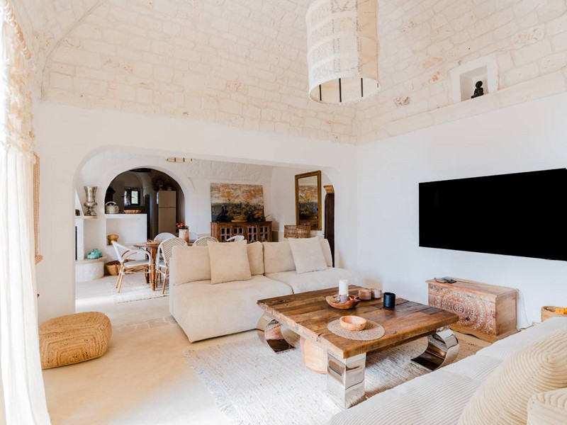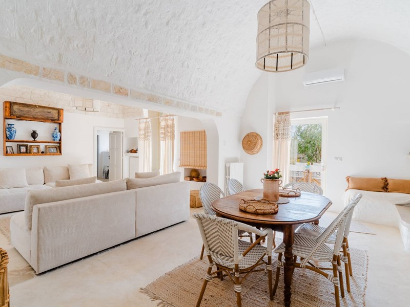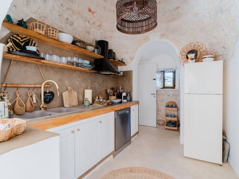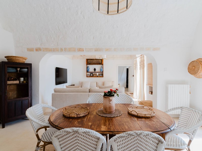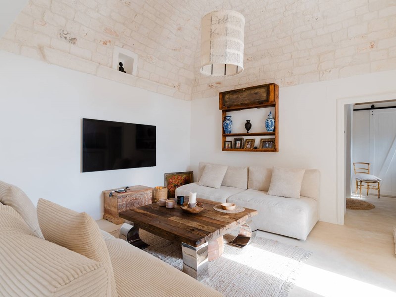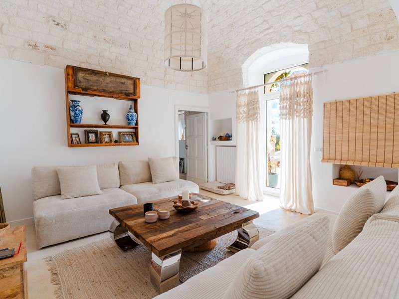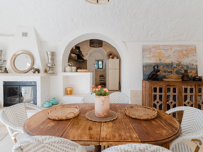 All'interno dei trulli, gli ambienti, hanno mantenuto tutto il loro carattere rustico, pienamente riscontrabile dai muri con pietra a vista.
