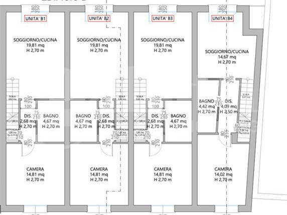 VILLETTA A SCHIERA B4: Sviluppata su due livelli, al piano terra troviamo ingresso su soggiorno con angolo cottura, disimpegno, bagno e camera. Al piano superiore due camere da letto, disimpegno, guardaroba e terrazzo.