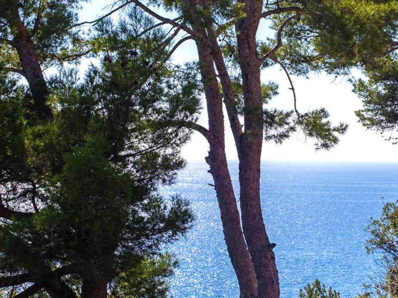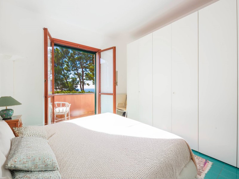 L'ampio trilocale si apre su un luminoso e ampio soggiorno dal quale si accede ad una balconata con incomparabile vista sul mare aperto, in corrispondenza della rinomata Baia del Corvo. Tutti gli ambienti, di generosa metratura, danno accesso al balcone o al giardino privato. La cucina abitabile è arredata e completamente attrezzata.