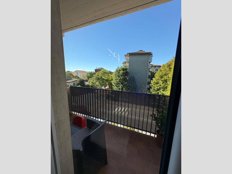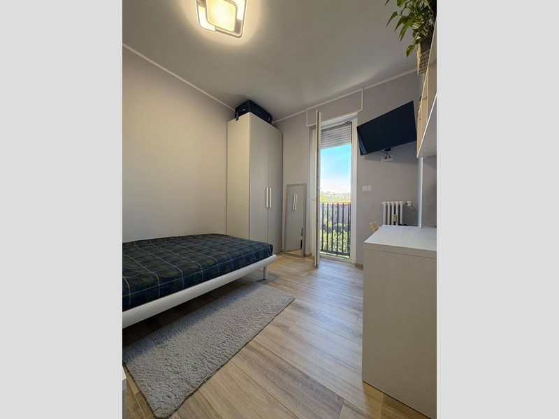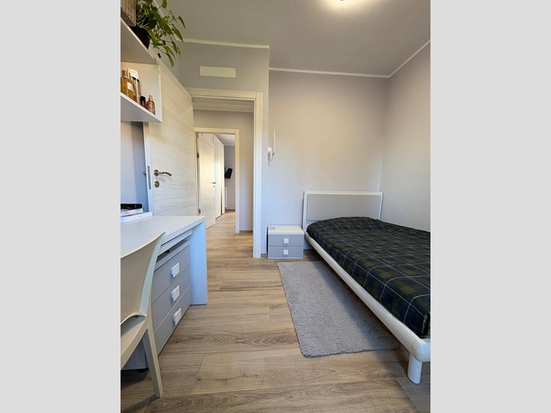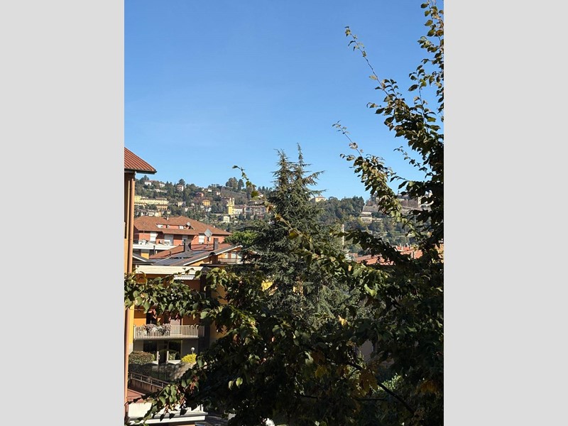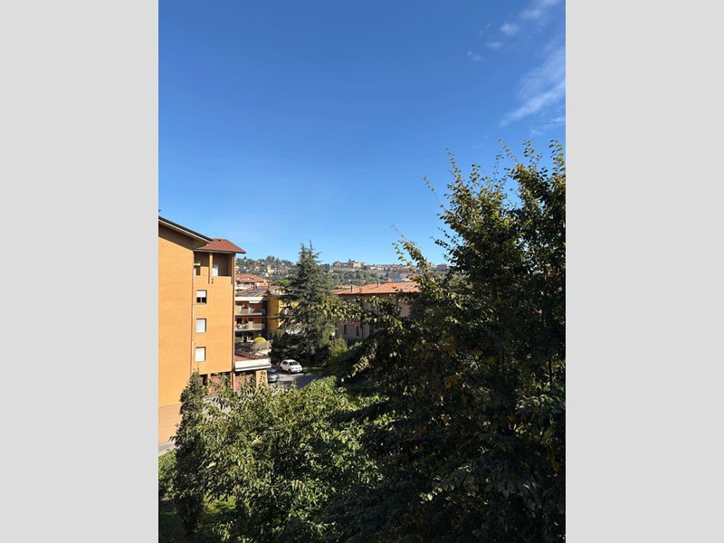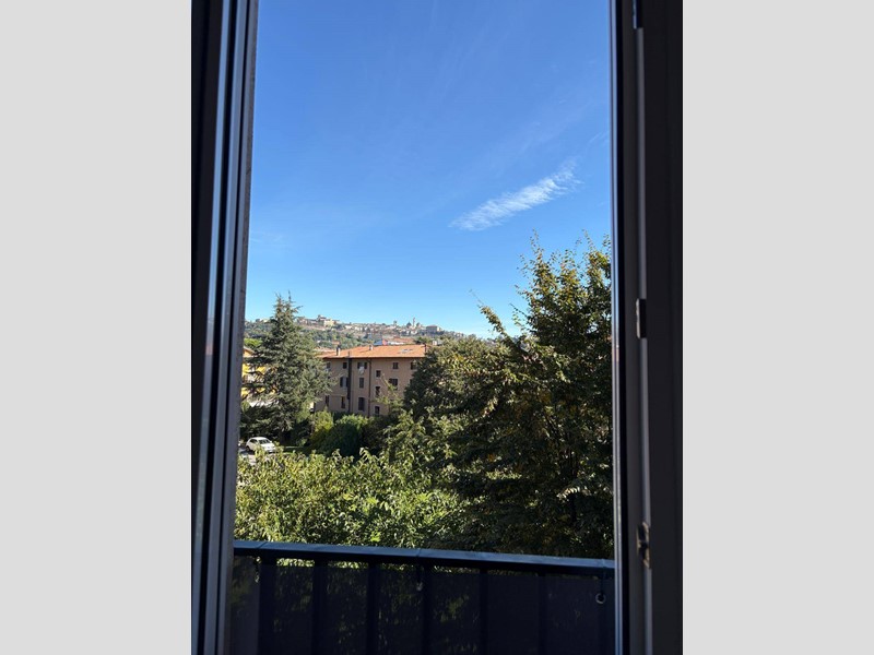 ampio soggiorno diviso in zona living, tavolo da pranzo e con cucina ad angolo cottura, due balconi, il primo esposto a sud e il secondo a nord con vista su verde e scorcio di Città Alta, due bagni finemente ultimati di cui il secondo cieco e quattro camere da letto, tre singole e una matrimoniale. completa la proprietà una cantina al piano terra.