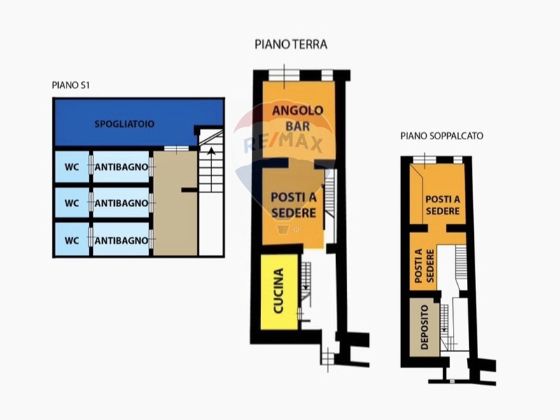 - Spazi interni: Area posti a sedere, area bar, cucina, 3 bagni con antibagno, spogliatoio per il personale, area deposito vettovaglie.
