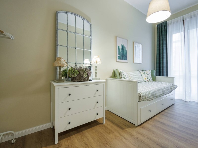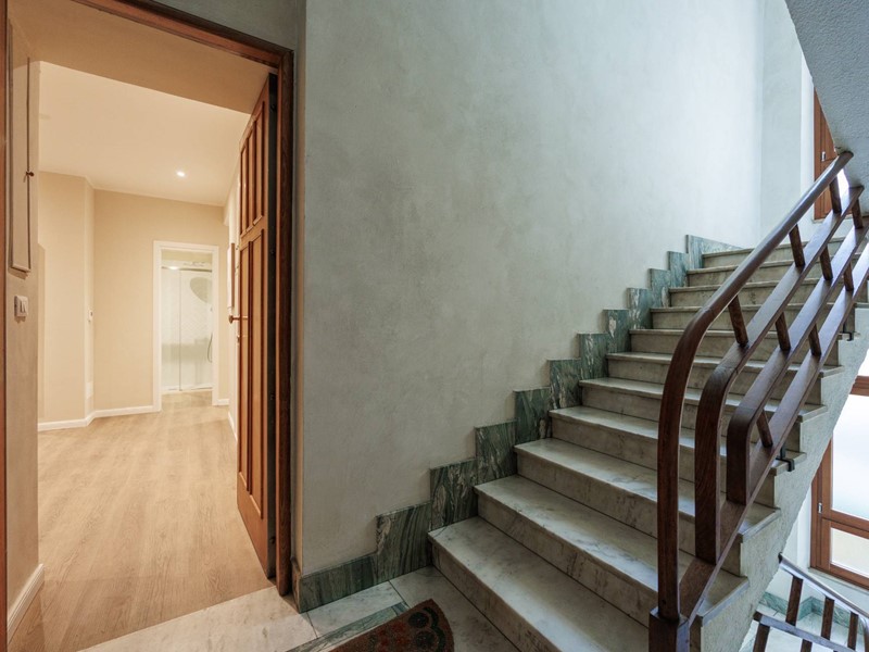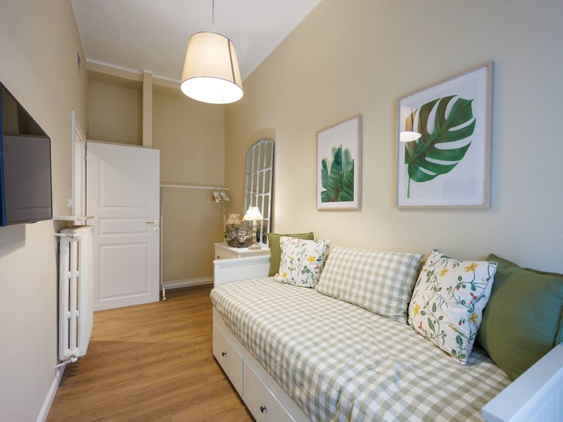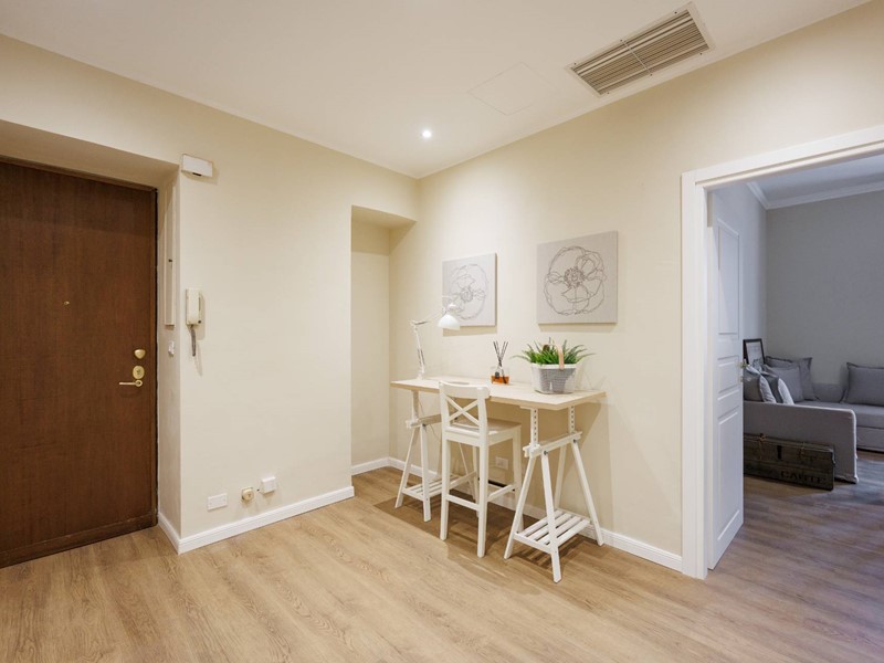 è composto da un ampio ingresso in cui è stata ricavata una zona studio, uno spazioso soggiorno con cucinino a vista, una camera da letto matrimoniale, una cameretta e due bagni. Un balcone con affaccio sulla Via Cassini e un balcone verandato sull'interno cortile.