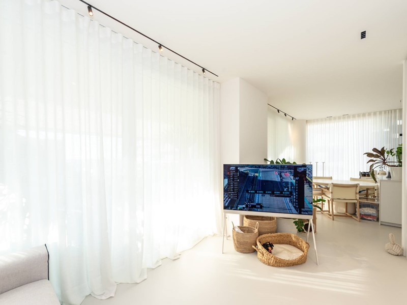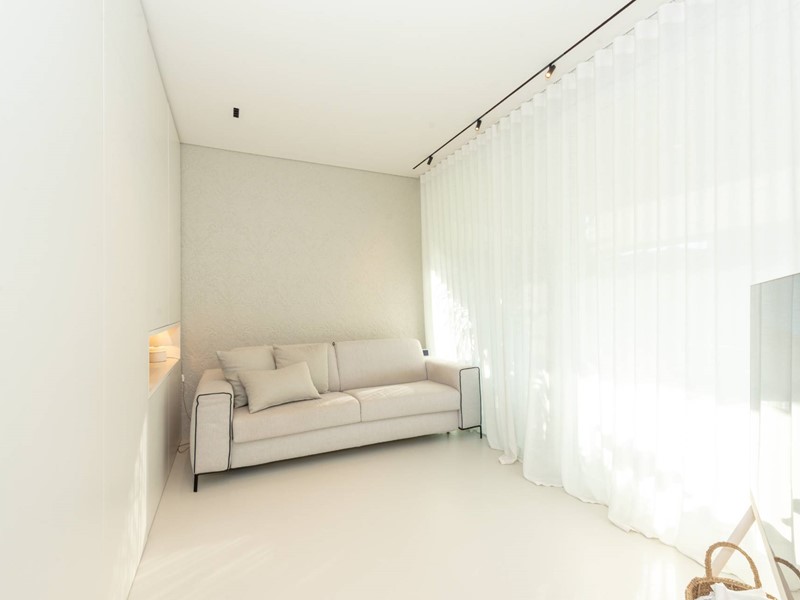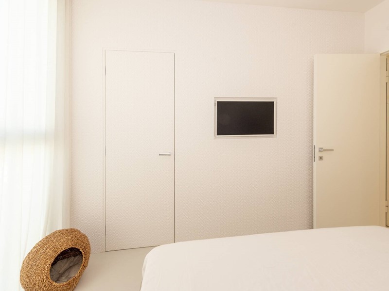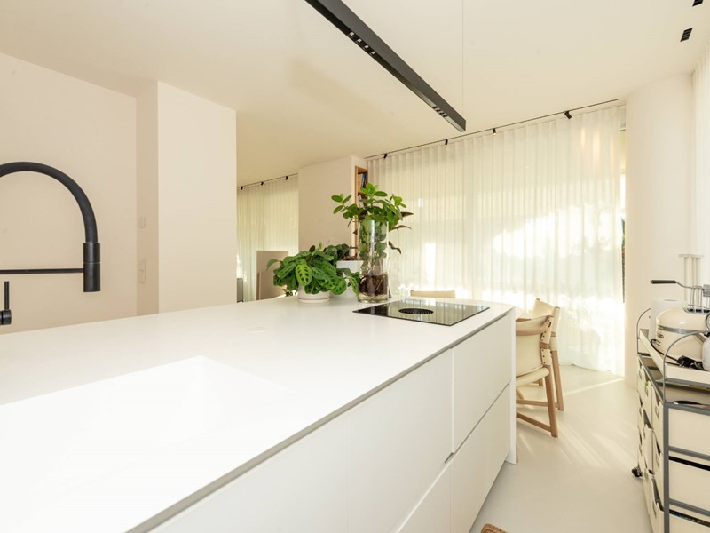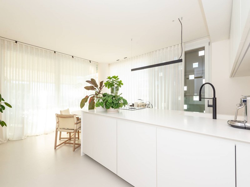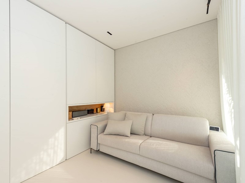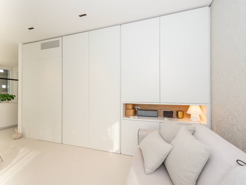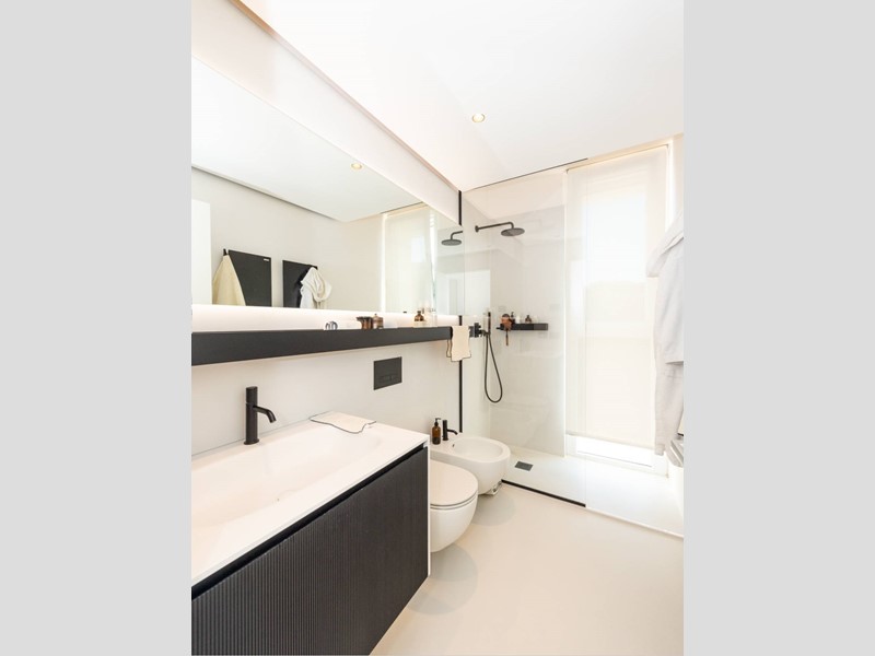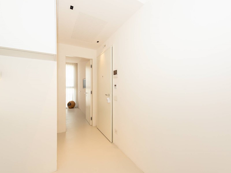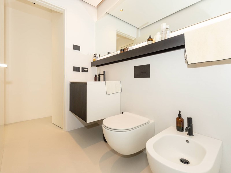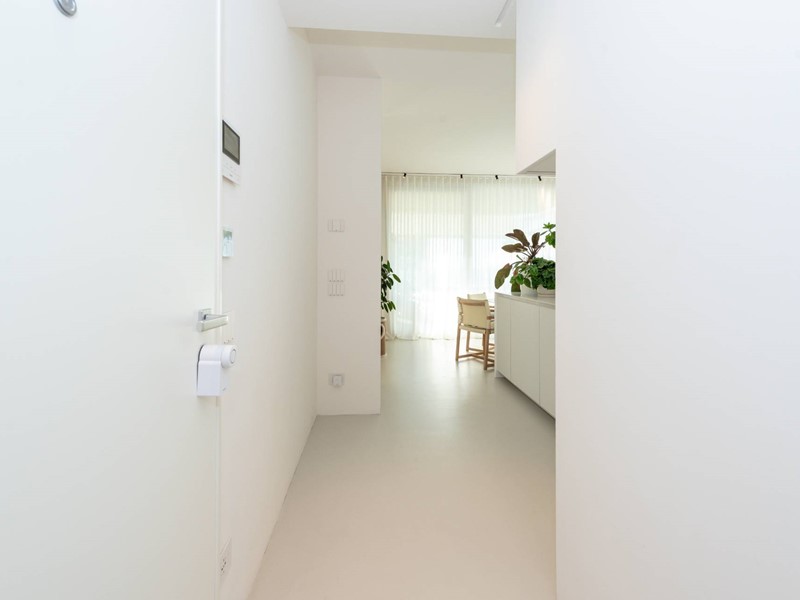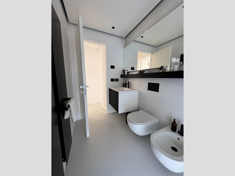 Finiture di pregio: pavimento in resina, serramenti in PVC con doppia vetrocamera e vetro accoppiato esterno, predisposizione allarme sui serramenti e porta blindata. Dotato di riscaldamento a pavimento con pompa di calore, raffrescamento canalizzato e domotica avanzata. Dettagli esclusivi, come la carta da parati in fibre naturali, completano un ambiente elegante e sostenibile.