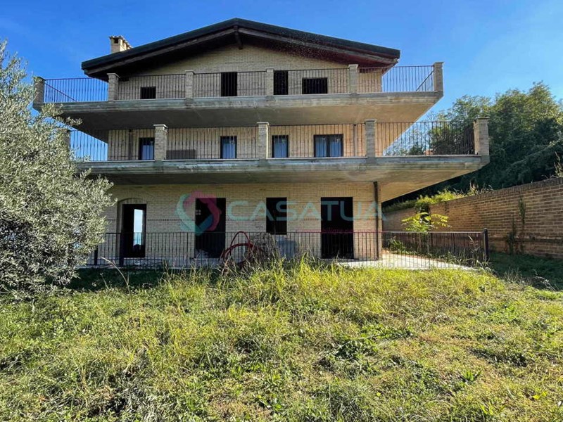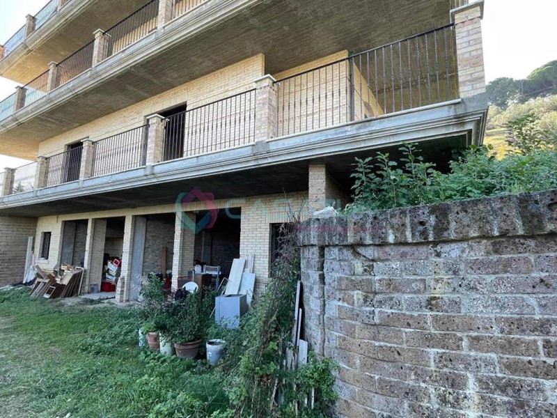 Quadrifamiliare esternamente rifinita con mattoni a vista, balconi pavimentati con mattonelle antiscivolo. Il piano seminterrato è suddiviso in 4 garage, 3 ripostigli, 4 cantine il tutto allo stato grezzo. Al piano terra si trovano due appartamenti separati, uno di 77 metri quadri, composto da un soggiorno con angolo cottura, 2 bagni, un ripostiglio, disimpegno e due camere matrimoniali con balcone perimetrale. Il secondo appartamento di 84 metri quadri è composto da un soggiorno, cucina, 2 bagni, 2 camere da letto, uno studio, corridoio e balcone perimetrale. Entrambi gli appartamenti sono internamente allo stato grezzo. Al primo piano troviamo un appartamento di 136 mq con soggiorno con angolo cottura, due camere da letto, stanza guardaroba con finestra, due bagni, disimpegno e un terrazzo perimetrale di 190 mq. L' Appartamento internamente è in stato parzialmente rifinito. Al secondo piano si trova il quarto appartamento di 118 mq, composto da un soggiorno con angolo cottura, 3 camere, 2 bagni, un corridoio e balcone perimetrale di 111 mq. L'appartamento si trova in stato grezzo. Ogni appartamento è dotato da ingresso separato. La soluzione ha già tutti gli impianti necessari (acqua, luce, gas) e un giardino di 9877 mq con 250 piante di olive.