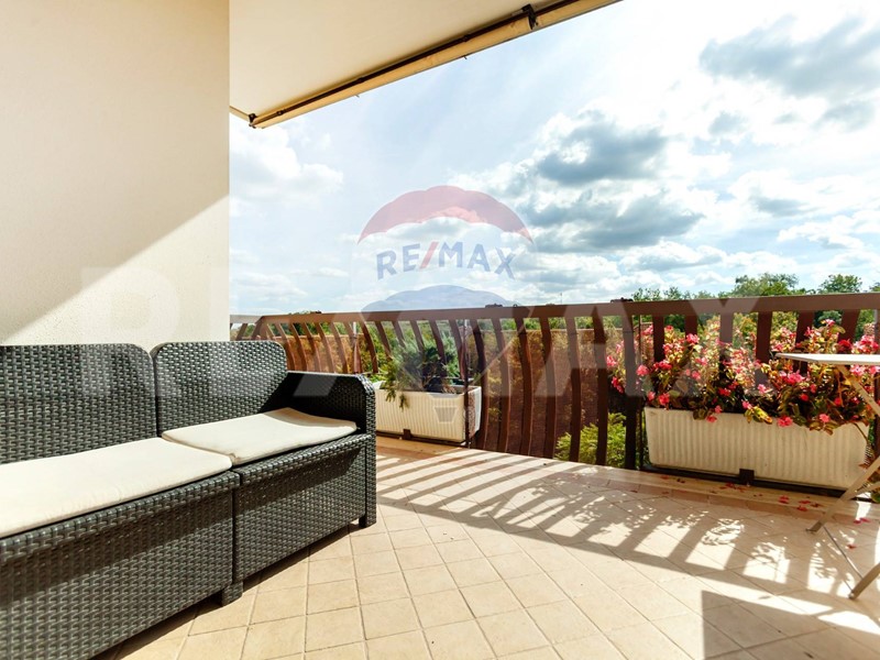 Da qui si accede a un grande balcone panoramico, affacciato sul verde del consorzio: lo spazio perfetto per leggere, pranzare allaperto o semplicemente rilassarsi a fine giornata.