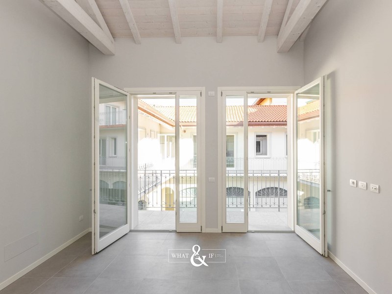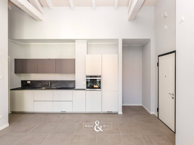 Appartamento trilocale posto al piano primo del corpo "B" caratterizzato da travi a vista molto alte e composto da soggiorno con cottura, disimpegno, bagno, cameretta, ripostiglio/lavanderia, camera matrimoniale con bagno en-suite oltre al balcone privato. Dotato di arredo cucina e arredo bagni. Nel corpo "B" non è presente l'ascensore.