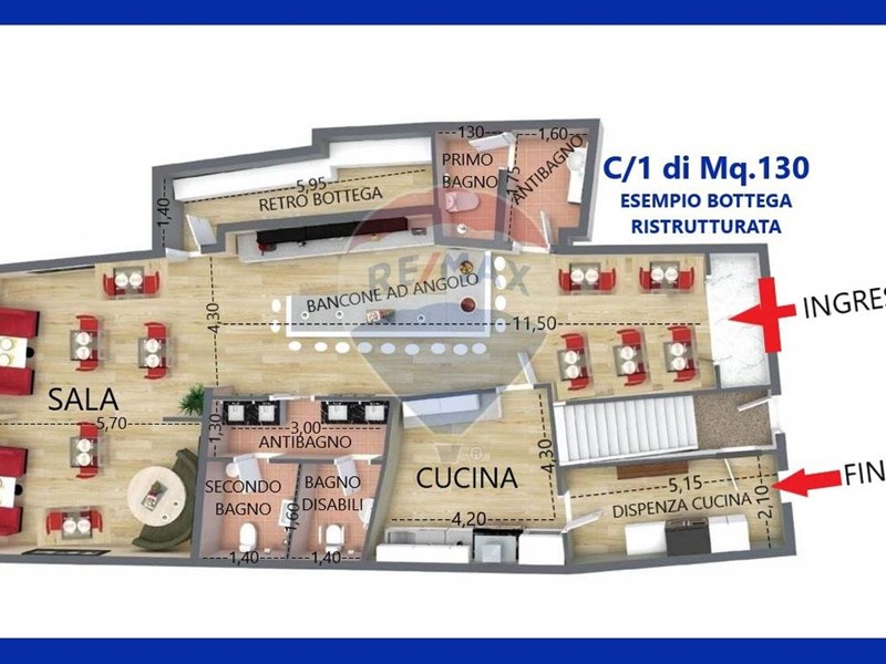 Sono presenti inoltre 4 bagni, garantendo il massimo comfort per i clienti e il personale.Lo stato di conservazione attuale è da ristrutturare, offrendo la possibilità di personalizzare gli spazi secondo le proprie esigenze e gusti.