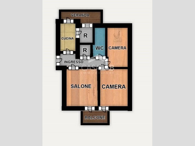 Ingresso su salone, cucina abitabile con dispensa e veranda, due camere da letto, un bagno recentemente ristrutturato, ripostiglio e balcone.
