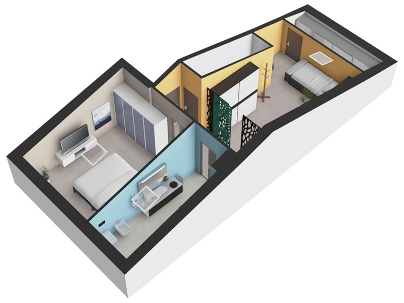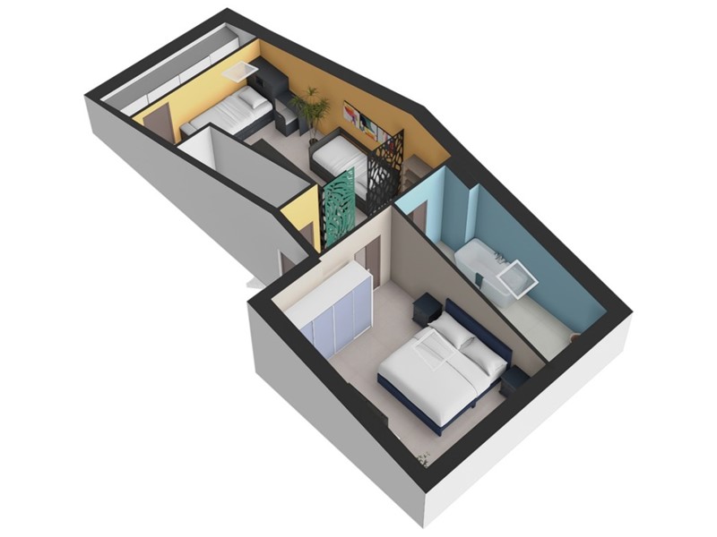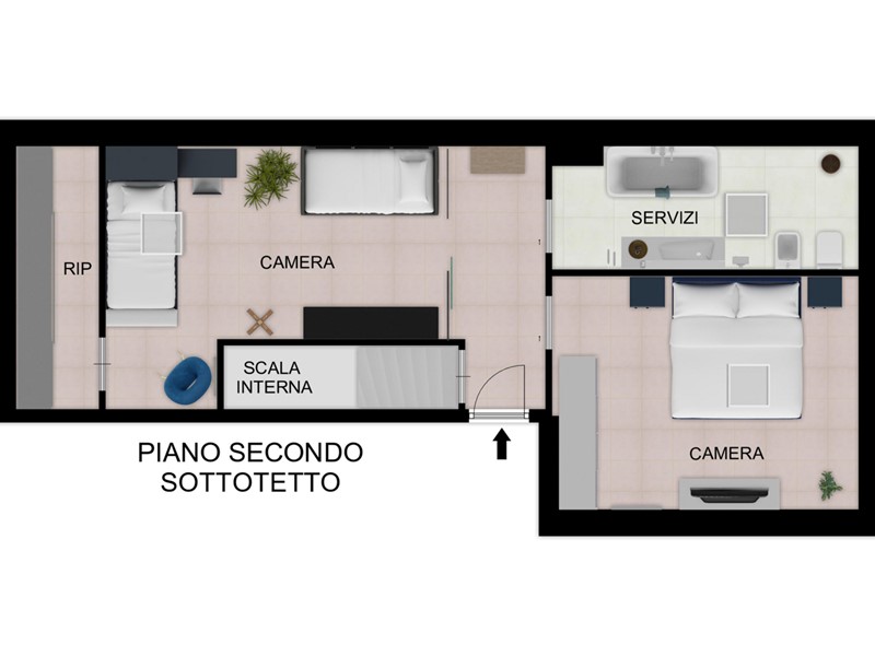 Tramite scala interna si sale al piano mansardato, qui sarai accolto da due accoglienti stanze con travi in legno a vista e da un ulteriore servizio. Importante da evidenziare è che l'accesso a questo piano è possibile anche da scala condominiale, il tutto per garantire la massima comodità.
