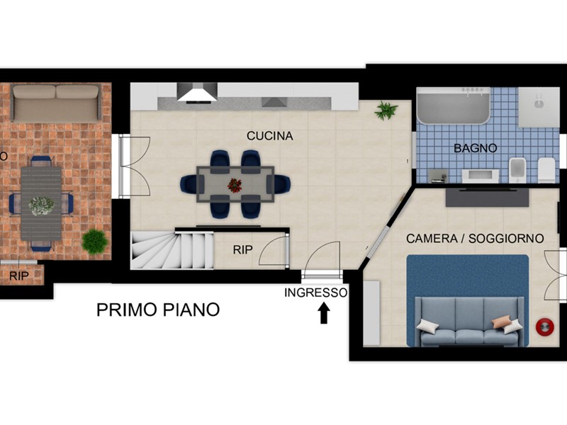 Al primo piano, troverai la zona giorno realizzata con due locali distinti: la cucina abitabile a vista con accesso al terrazzo coperto, ideale per godersi momenti di relax all'aria aperta; il comodo soggiorno con affaccio sul balcone. Il ripostiglio e il bagno di generose dimensioni completano questo livello.