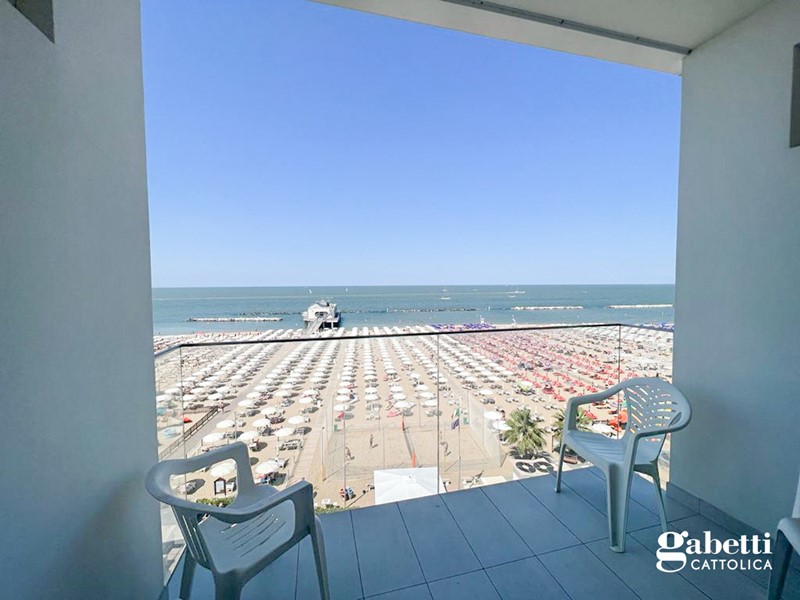 GABICCE MARE | PRIMA LINEA VISTA MARE Proponiamo trilocale al quinto piano composto da comoda zona giorno con cucina a vista, due camere, due bagni e balconi. C. e. in richiesta. Rif. P1054/12