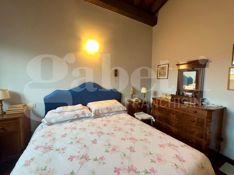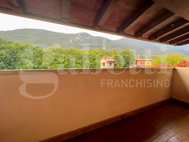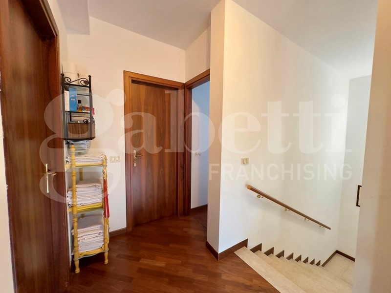 Una suggestiva parete in vetro separa la zona giorno dalla scala principale, che conduce ai piani superiori, dove trovano spazio tre camere da letto caratterizzate da soffitti alti con travi in legno a vista, due bagni finestrati e una terrazza coperta con splendida vista sul colle di Botticino.