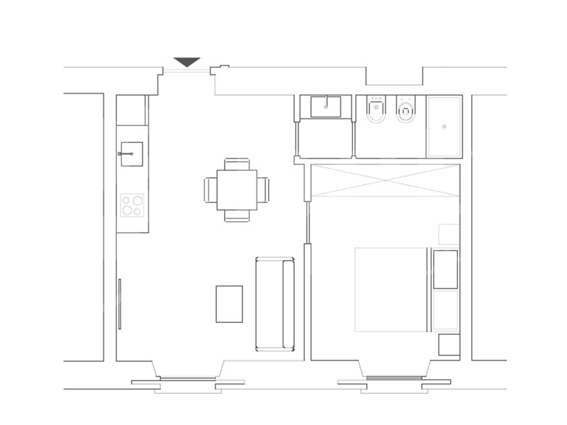L'appartamento è composto da un soggiorno con cucina a vista, camera da letto e bagno.