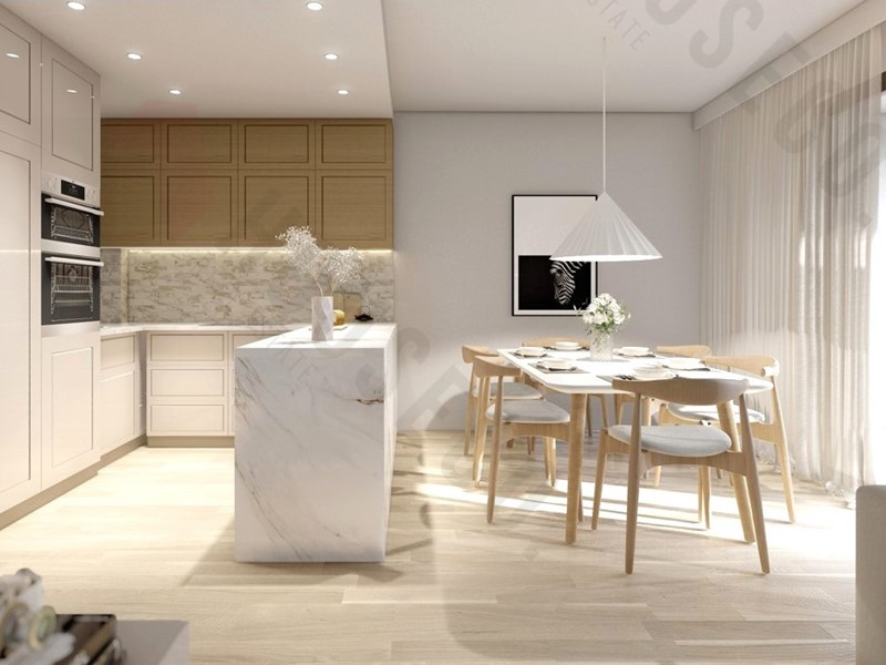 -Zona living open-space con angolo cottura a vista, perfetta per momenti di relax e convivialità, che si apre su una veranda spaziosa di 14 mq