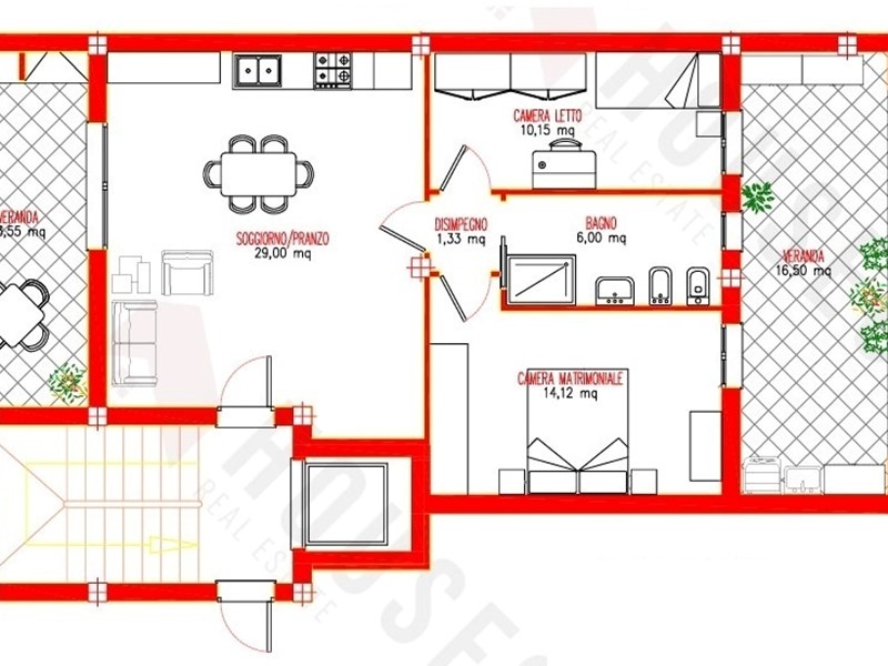 -Zona living open-space con angolo cottura a vista, perfetta per momenti di relax e convivialità, che si apre su una veranda spaziosa di 14 mq