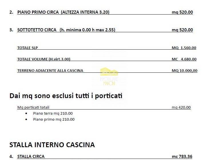 Con una superficie totale di 1.560 metri quadrati di SLP e una cubatura totale di 4.680 metri cubi, questa proprietà si estende su tre piani ed è composta da molteplici locali su tutti e tre i livelli, due porticati per un totale di 420 mq e STALLA/FIENILE su due livelli di 780 mq circa.
