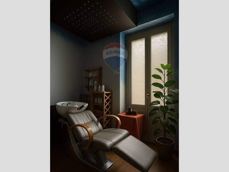Attraverso due gradini si accede alla zona relax, pensata per offrire ai clienti unesperienza di benessere completa. Qui si trova un lavatesta con poltrona massaggiante rialzabile e dispositivo per cromoterapia, una postazione per lanalisi del capello e una cabina multifunzione dotata di lavandino, ideale per trattamenti estetici come ceretta o unghie. La zona dispone di un secondo split, scaldacqua a gas e riscaldamento centralizzato. Il bagno ampio e finestrato, con antibagno e lavatrice, è completo di scaffalature e illuminazione. Anche in questa zona c'è l'uscita sul cortile.