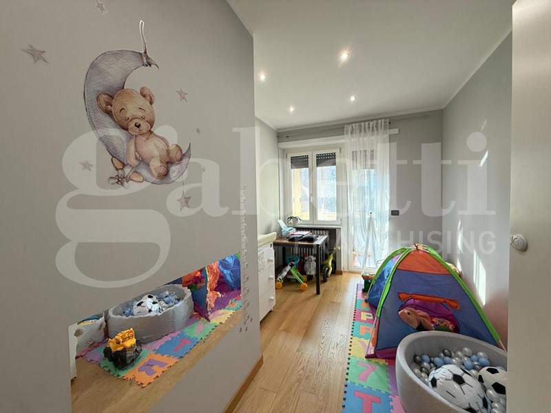 Il disimpegno separa in modo funzionale la zona giorno dalla zona notte, dove troviamo una spaziosa camera matrimoniale, una cameretta ideale per bambini o studio, e un bagno con finiture contemporanee. Completa la disposizione interna un comodo ripostiglio, pratico per organizzare al meglio gli spazi di casa.