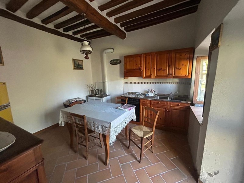 L’ingresso indipendente conduce a un soggiorno con angolo cottura caldo e luminoso, dove travi a vista e muri in sasso creano un’atmosfera piacevole e curata.