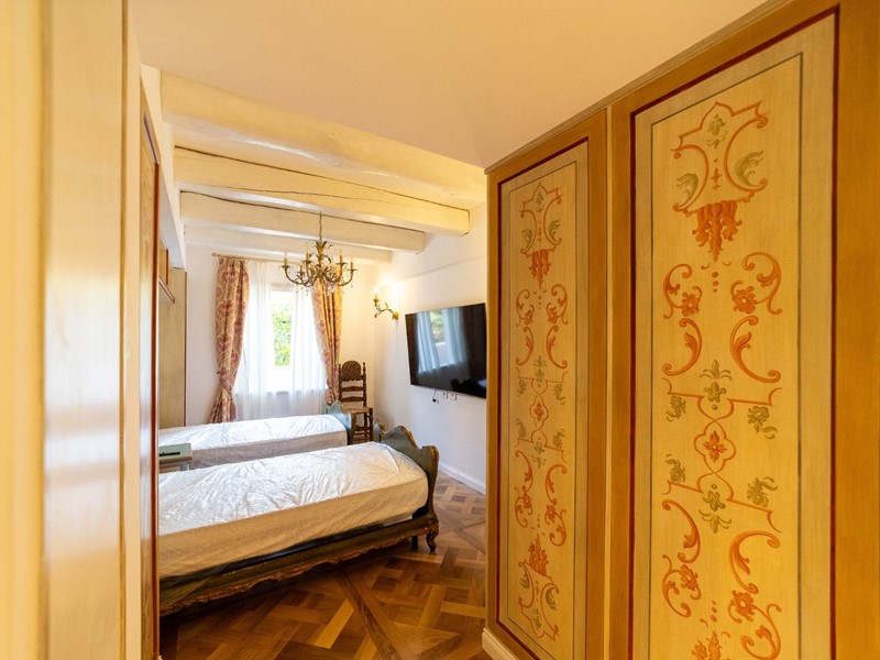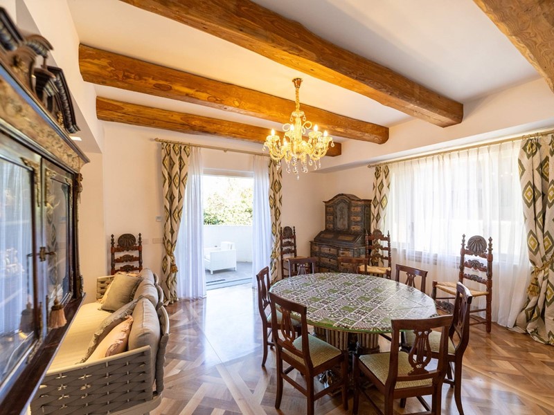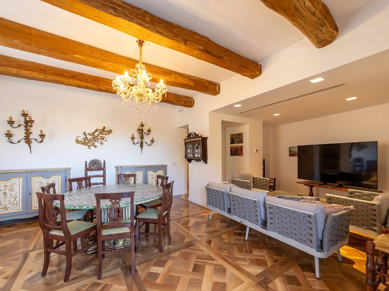 Il soggiorno accoglie con unatmosfera calda e raffinata, arricchita da travi in legno a vista, pavimenti in parquet decorato e arredi in stile classico toscano, con elementi artigianali e lampadari in cristallo. La cucina, moderna e funzionale, si integra perfettamente con lo stile elegante della casa.