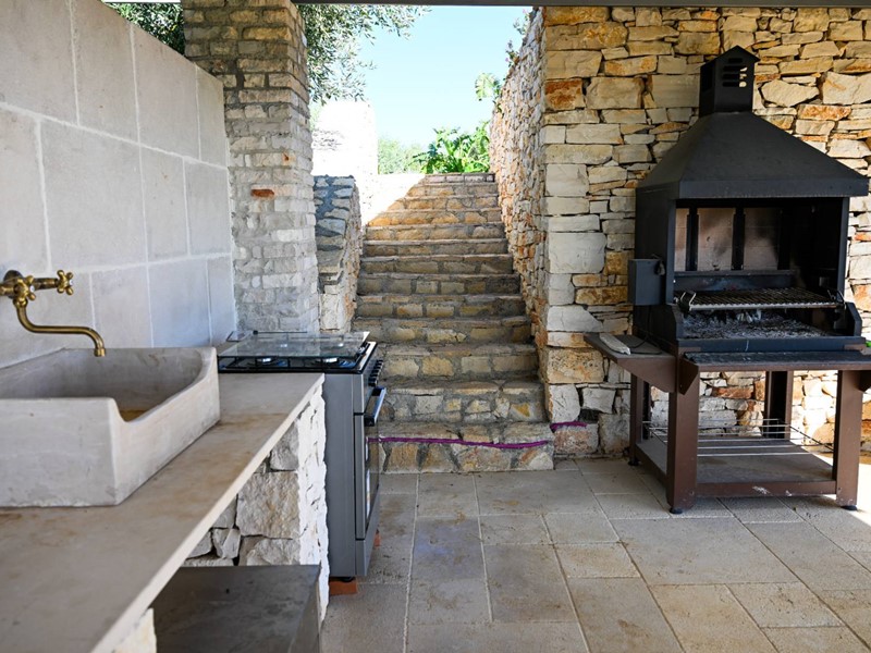 Il pergolato con cucina esterna, barbecue e forno a legna per pizza crea lo scenario perfetto per serate conviviali sotto le stelle.