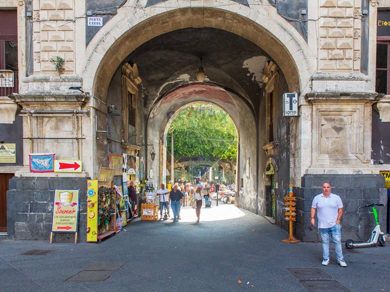La bottega si trova esattamente sotto la Porta Uzeda ovvera..............
