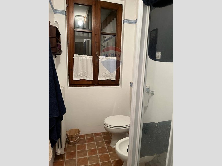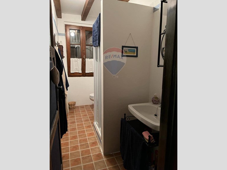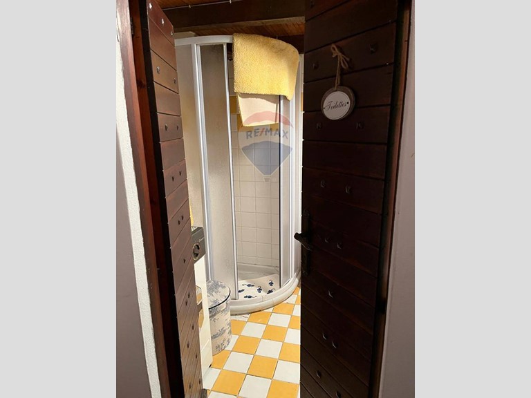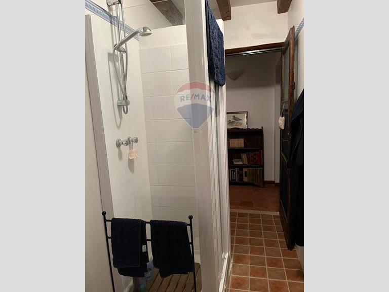 Dal primo ingresso si accede al disimpegno, sul lato destro è presente un bagno finestrato con doccia, una scala porta al piano superiore con accesso alla camera da letto.