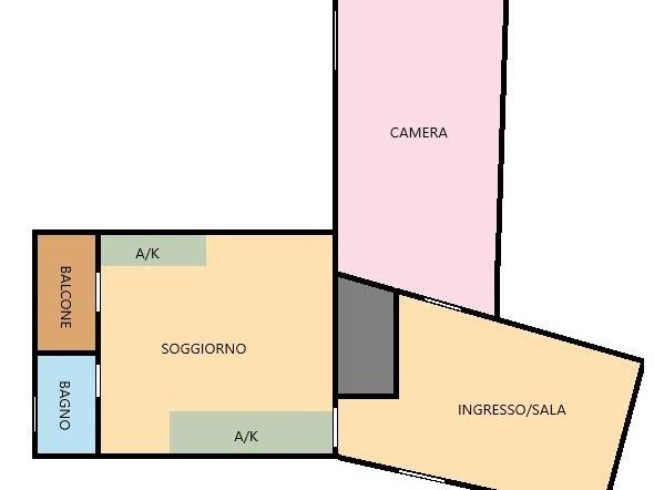 Ampio ingresso, soggiorno con angolo cottura, camera da letto, bagno finestrato con doccia e balcone con affaccio libero.