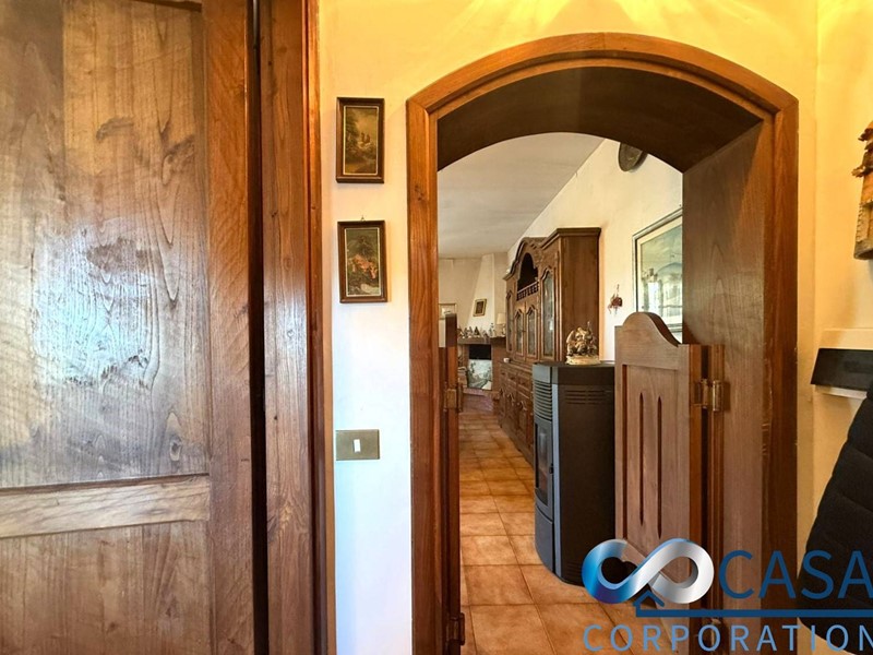 Livello Piano terra: Portico, ingresso, ampio salone doppio con camino, cucina separata abitabile con camino e balcone con vista panoramica, bagno finestrato con doccia, terreno e giardino.