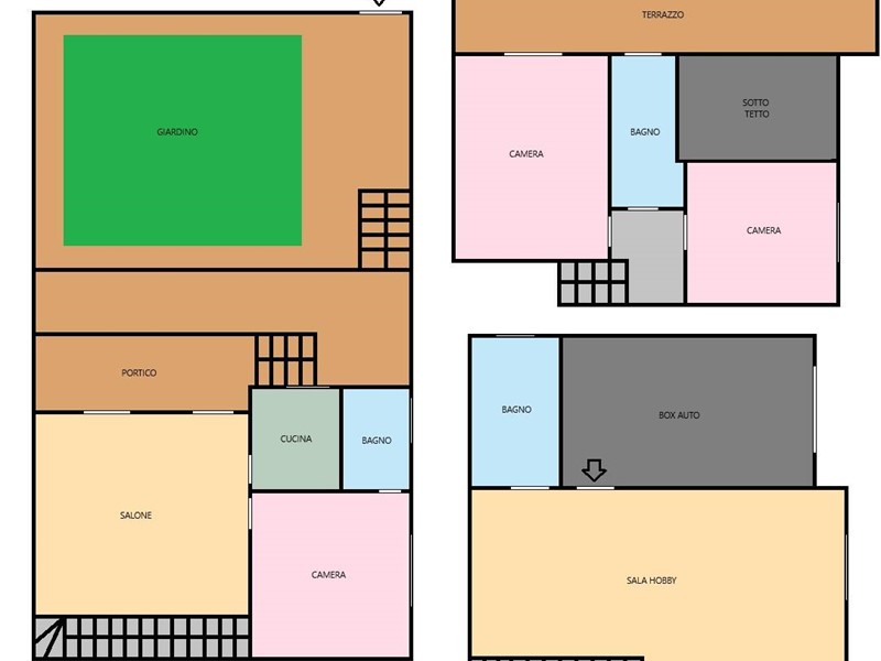 Piano Terra Rialzato: Giardino, ingresso, portico, salone, cucinotto, camera da letto con bagno privato finestrato con doccia.