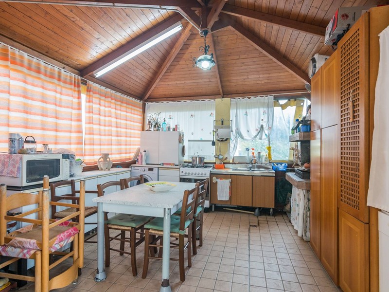 La cucina abitabile è composta da ampie finestre che regalano luce naturale per tutto il giorno con una comoda uscita diretta sul giardino, ideale per portare allesterno pranzi estivi.