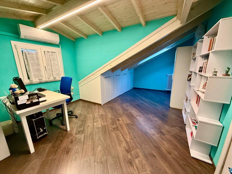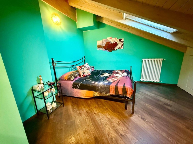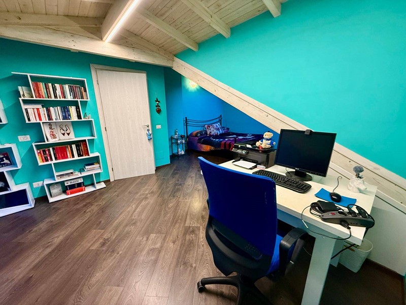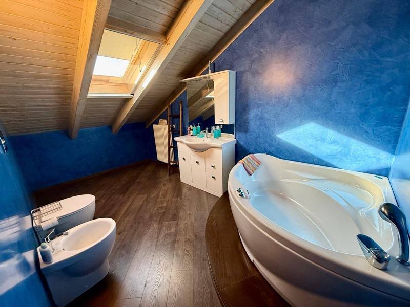 Il livello mansardato ospita due ulteriori camere da letto e un ampio bagno, offrendo spazi funzionali e ben distribuiti per tutta la famiglia.