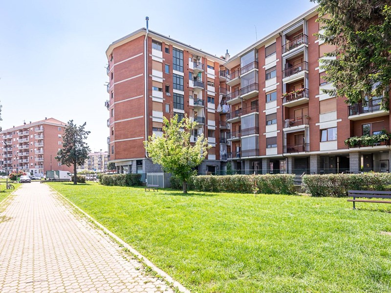 Il condominio ove è ubicato l'alloggio è stato costruito negli anni settanta, ed è stato oggetto di una recente ristrutturazione in facciata trovandosi così in buone condizioni generali. L'appartamento, posto al secondo primo si sviluppa su superficie catastale di 98 metri quadrati ed è dotato di due ampi balconi, il primo con affaccio su strada Torino e l'altro sul giardino comunale.