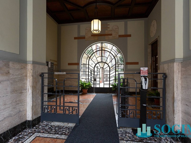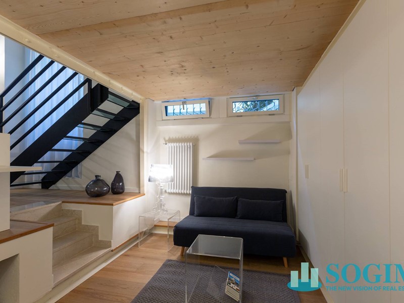 in elegante palazzo d'epoca di inizio secolo con servizio di portineria proponiamo esclusivo ampio loft al piano terra, composto da ingresso, zona living con cucina a vista, ampia zona studio con divano letto e armadi su misura, bagno con doccia.