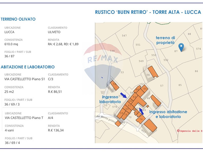 Si compone di un fabbricato suddiviso in due unità immobiliari: un laboratorio di 25 mq e un appartamento con cucina, disimpegno, bagno e due camere. Allesterno un ripostiglio e unarea di verde antistante.