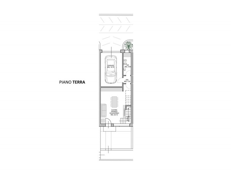 PIANO TERRA: Accoglienza e vita quotidiana. Un open space luminoso che unisce soggiorno e cucina, un bagno di servizio e un comodo garage privato.
