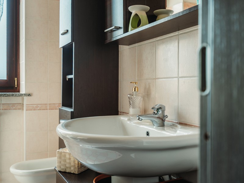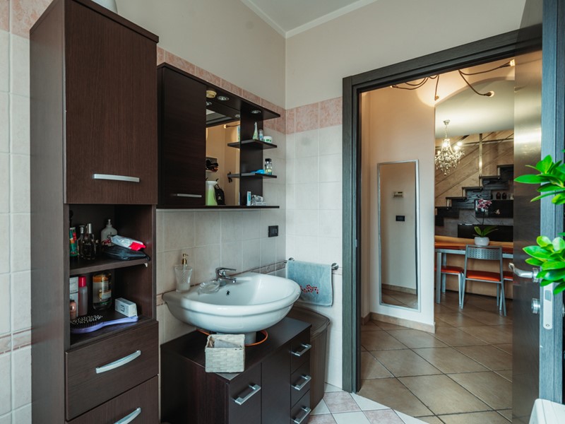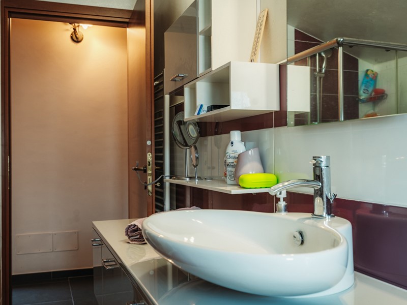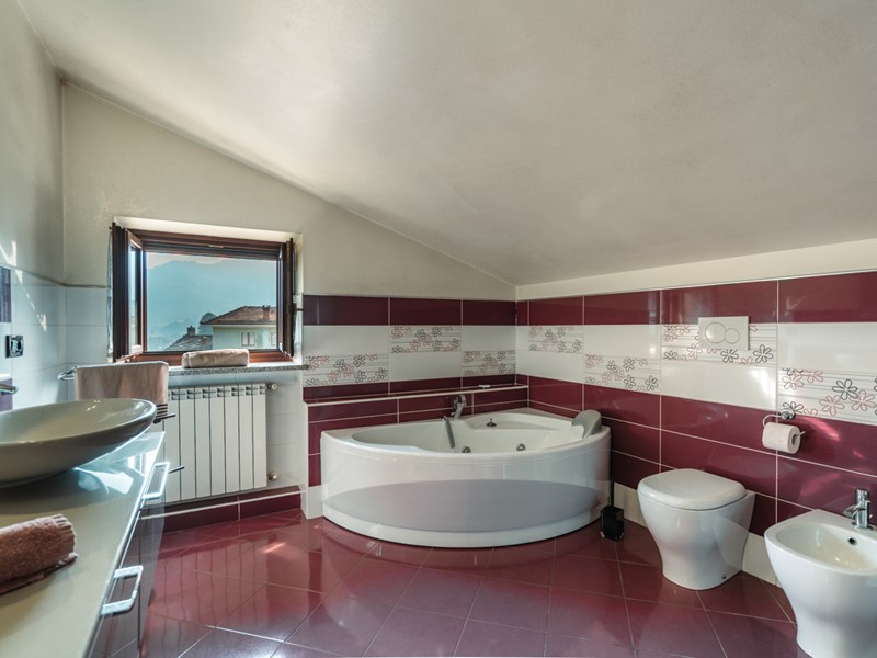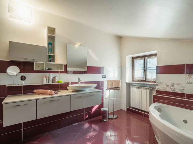 La sala da bagno è un ambiente di vero benessere: vasca idromassaggio, doccia, finestra e rivestimenti ricercati, pensati per chi ama concedersi momenti di relax autentico.