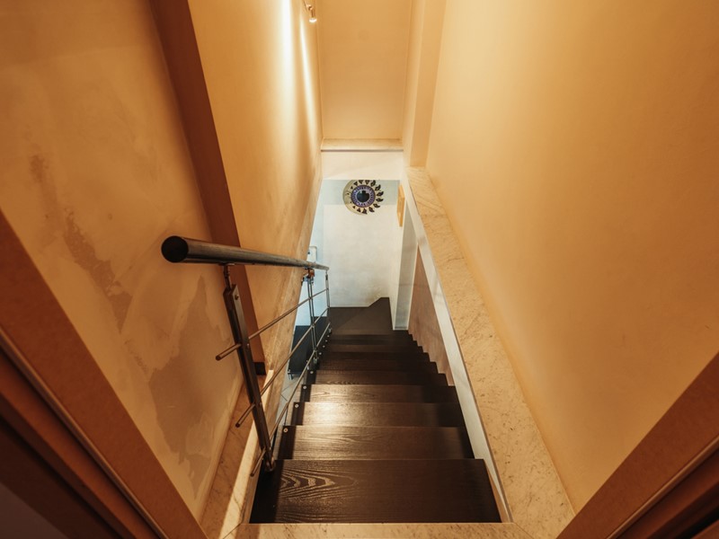 La protagonista del collegamento interno è una bella scala a vista di design, che si integra con eleganza nell'ambiente e accompagna alla zona notte con leggerezza e carattere.