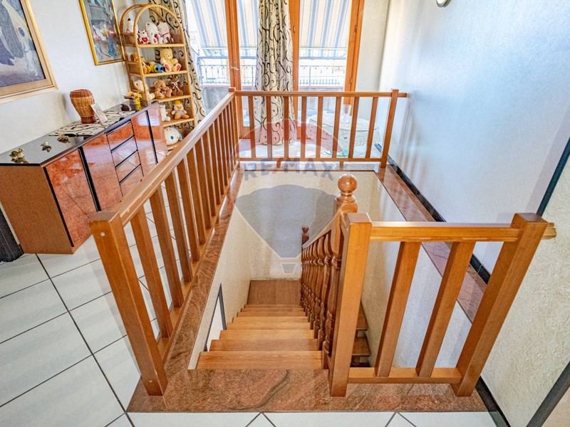 Sul disimpegno troviamo una scala interna in legno, che ci porta al piano mansardato, composto da un corridoio con balcone verandato, cucina soggiorno con piccolo ripostiglio, altre 2 camere da letto balconate ed un servizio.