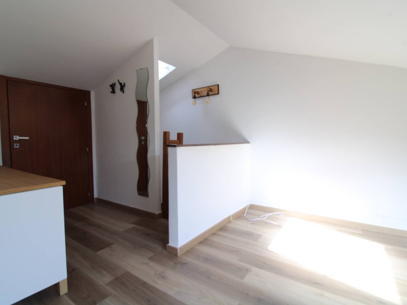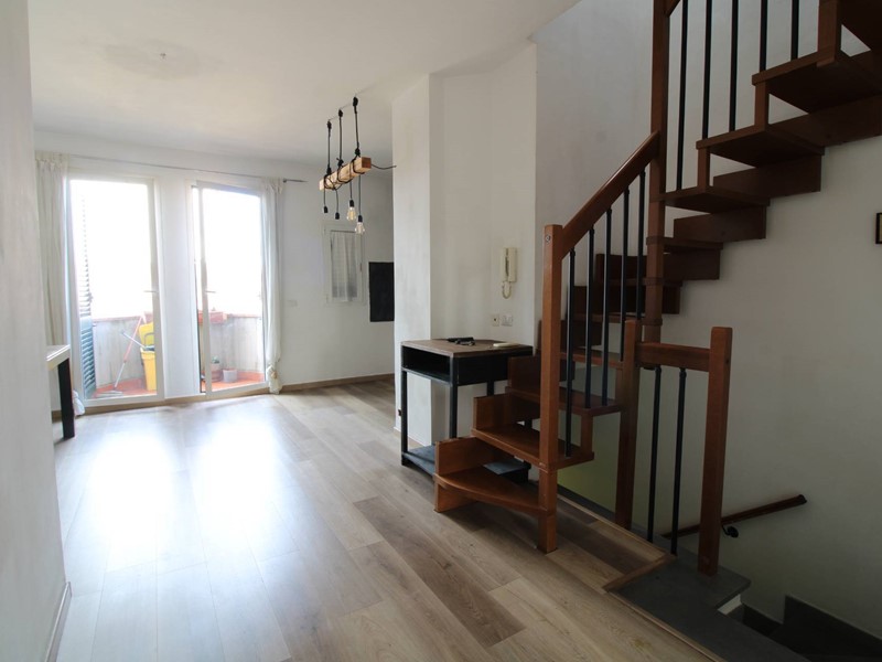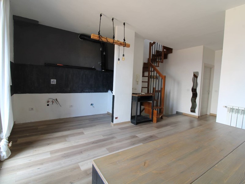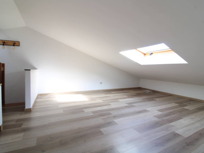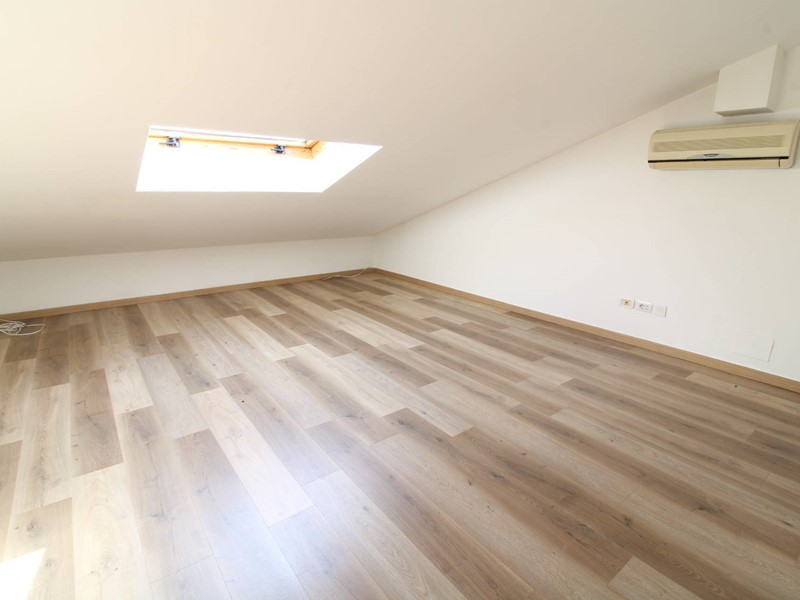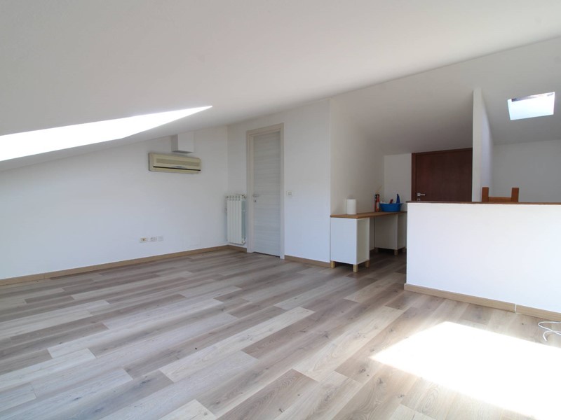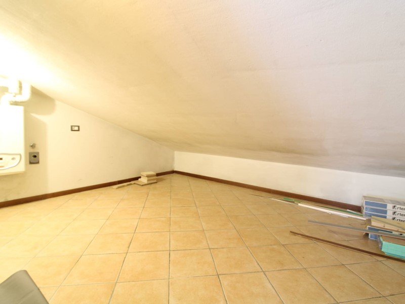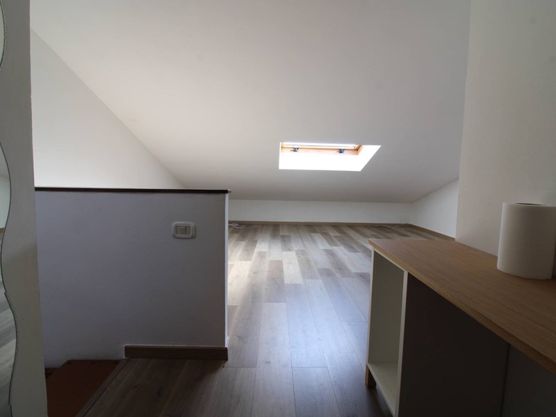 Dalla porta d'ingresso la scala ci conduce al primo piano dove si trova la luminosa zona pranzo soggiorno con due porte finestre che permettono di accedere al balcone con affacci sul piazzale condominiale; sul lato opposto troviamo due stanze (utilizzabili come camere o soggiorno) entrambe con accesso al balcone tergale con affacci sui giardini. La scala in legno permette di accedere all' ampio sottotetto dotato di un generoso lucernario che rende l'ambiente molto luminoso; la parte più bassa, separata da una porta, risulta sfruttabile come ripostiglio ed è lì che troviamo la caldaia del termo autonomo. Troviamo inoltre un ripostiglio nel quale è stato predisposto un bagno completo di servizi e doccia. Tutti gli ambienti sono climatizzati e l' ottima esposizione (EST-OVEST) garantisce luminosità durante tutte le ore della giornata. Le spese condominiali ordinarie si attestano su una cifra al di sotto dei 20 euro mensili, rendendo l'abitazione estremamente conveniente dal punto di vista economico.