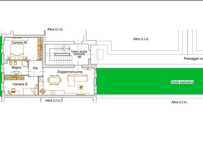 In questo annuncio proponiamo un appartamento di tre locali con abbondante giardino privato fronte e retro cosi' composto: soggiorno con angolo cottura a vista, disimpegno, due camere e bagno.