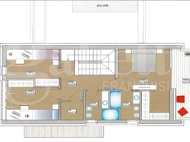 Ogni unità è disposta su due piani: al PIANO TERRA si trova UN'AMPIA ZONA LIVING con soggiorno e sala da pranzo da 61Mq, porticato e giardino privato, oltre al servizio e locali tecnici; al PRIMO PIANO si trovano la CAMERA MATRIMONIALE con BAGNO PRIVATO, cabina armadio e terrazza ABITABILE, oltre a due camere singole da 12Mq l'una, con bagno comune.