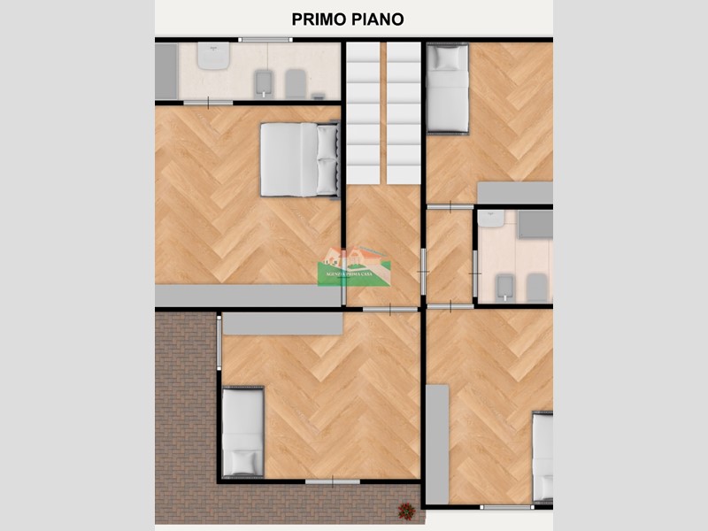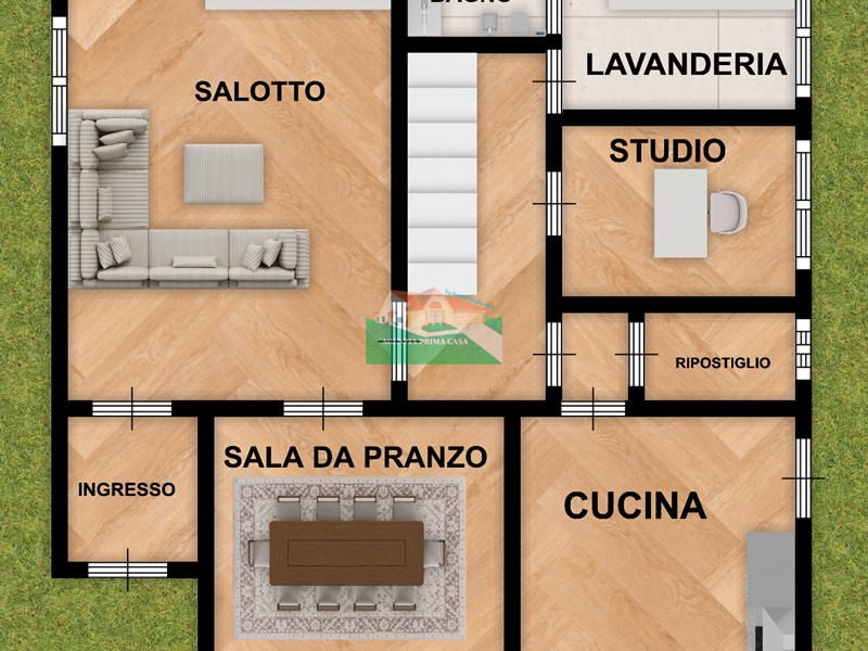 all'interno si compone da ingresso, ampia sala, sala da pranzo , cucina abitabile, bagno finestrato con box doccia, ripostiglio ove è collocata la caldaia, lavanderia, studio. Al primo piano si compone di 4 camere da letto (matrimoniale, due singole, e una doppia). al secondo piano è presente ampia mansarda con altezza massima 2,20.