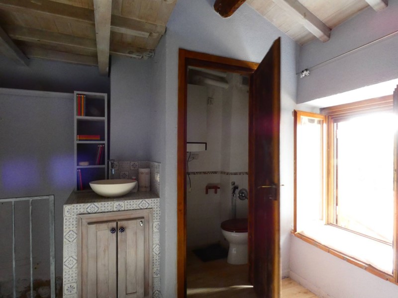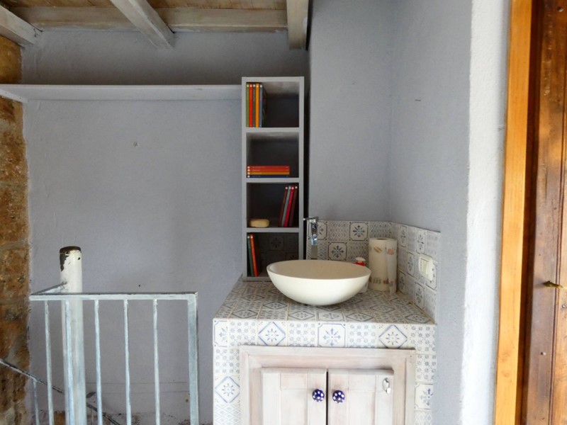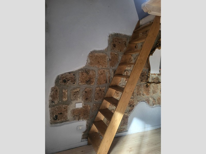 Anche in questo ambiente troviamo finiture di tufo alle pareti dove è alloggiata una nicchia con delle mensole e il pavimento è in parquet. Una piccola struttura in muratura con un lavabo dappoggio la fa un po' da padrone, mentre accanto, una porta antica di legno, cela un piccolo bagno. Ma la peculiarità di questo ambiente è il soppalco in legno rifinito con modanature, al quale si accede da una massiccia scala in legno di castagno.