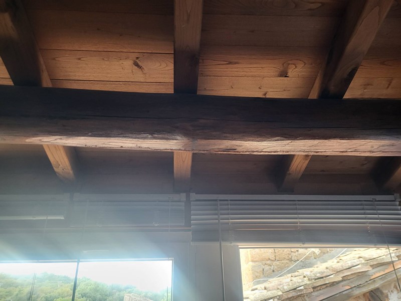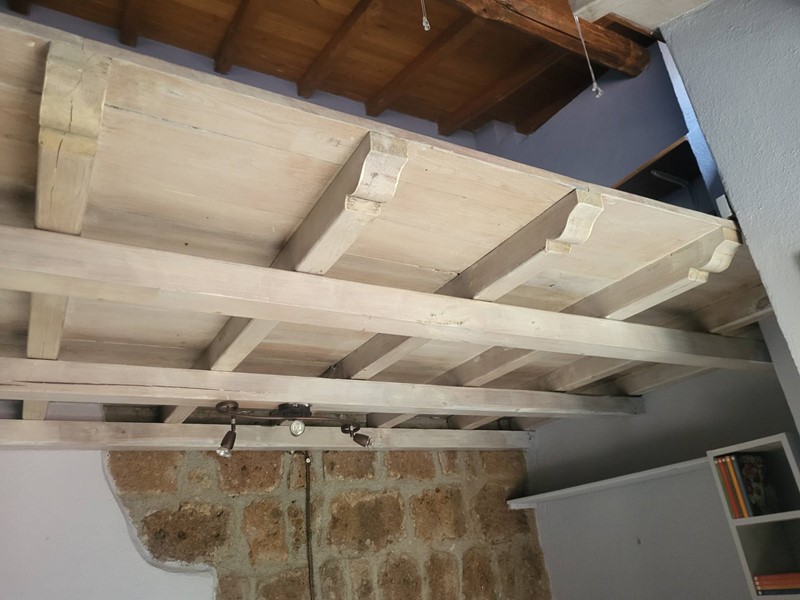 L alto soffitto a cassettoni permette di stare comodamente in piedi nonostante linclinazione ed è attraversato da una grande trave di legno.