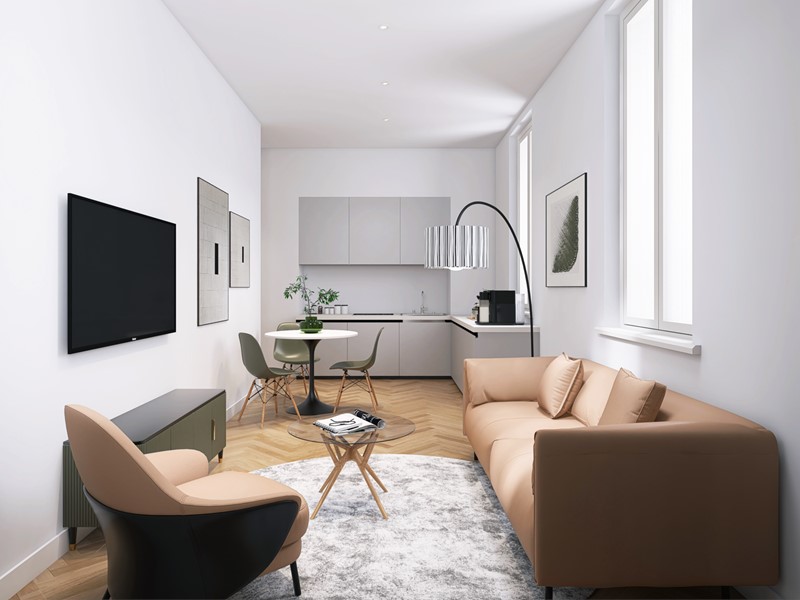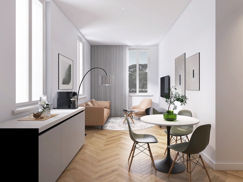 Entrando troveremo, lungo il corridoio d'ingresso, una comoda zona lavanderia ed un servizio; proseguendo, la soluzione si aprirà su un luminoso soggiorno con angolo cottura e con doppia esposizione che avrà vista sullo splendido parco di Villa Massimo. Troveremo sulla parte sinistra della soluzione un'ampia camera con affaccio sul verde. Completerà la proprietà un comodo soppalco.