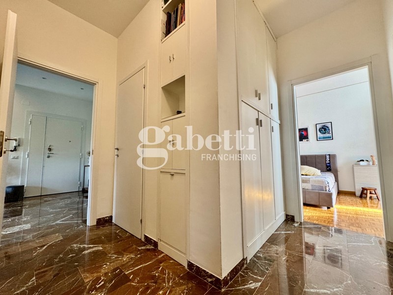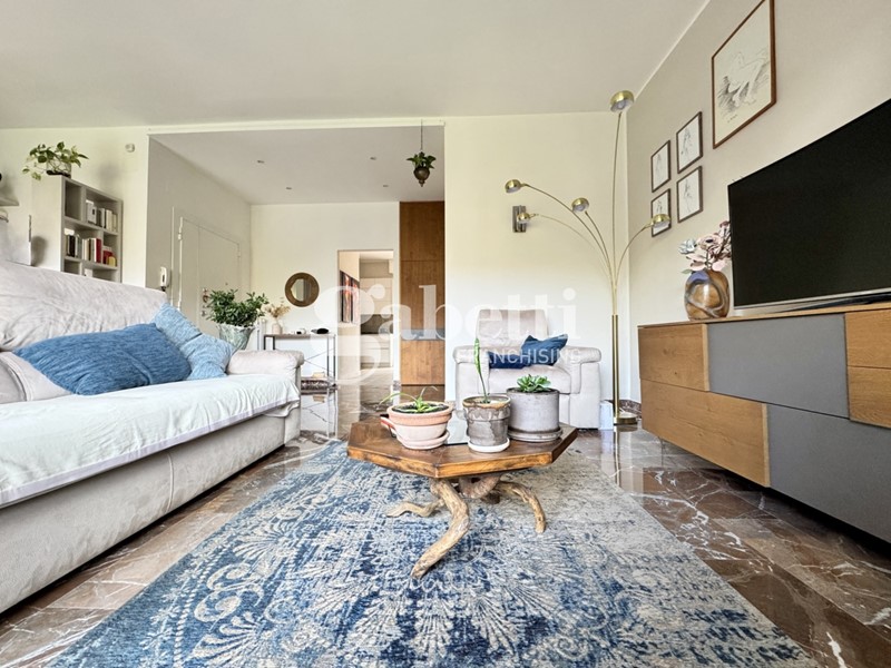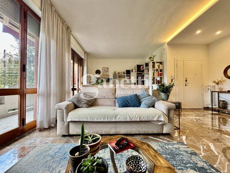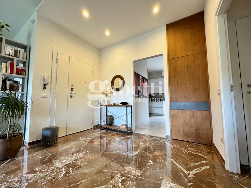 L'appartamento è composto da una zona di ingresso aperta sulla grande e luminosissima sala doppia da cui si accede alla prima terrazza abitabile, una grande cucina da cui si accede alla seconda terrazza sulla parte tergale, due grandi camere da letto, due bagni finestrati e un comodo ripostiglio, la proprietà è completata da posto auto e cantina.