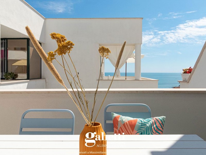 zona living con cucina a vista, camera matrimoniale, studio/cameretta, bagno con doccia e lavanderia finestrato, splendido terrazzo abitabile con vista mare.
