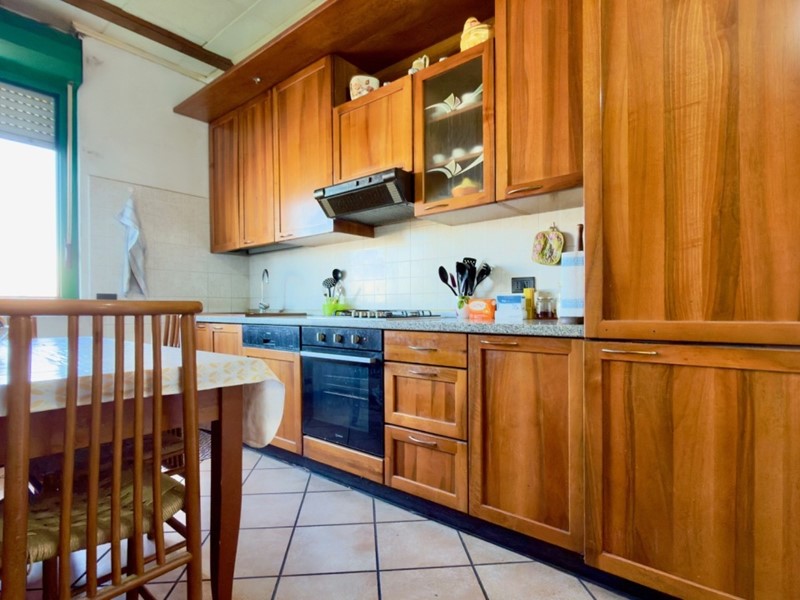 Al piano primo, l’abitazione è spaziosa e si sviluppa con soggiorno e cucinotto separati, tre camere da letto e due bagni.