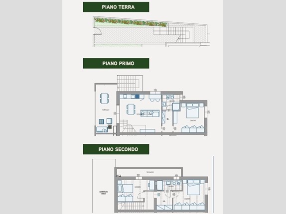 - Piano Superiore: camera doppia, camera matrimoniale, bagno finestrato con doccia e terrazzo riservato.
